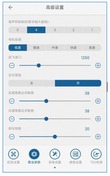 前后避障灵敏度:避障雷达的灵敏度设置,用于调节避障识别的灵敏度。灵敏度越强识别障碍物约灵敏,同时也会增加误报概率。一般设置40左右。
