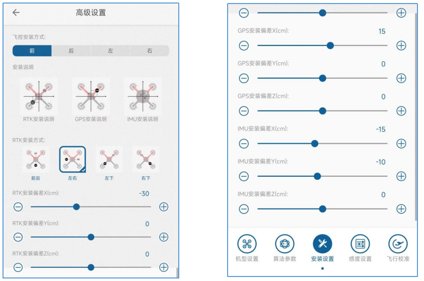 设置RTK/GPS/IMU安装误差:距离飞机中心位置的偏差,Z轴无需设置。(RTK指RTK天线1.)