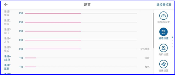 通道检测是用来测试遥控器与无人机是否连接正常,以及判断遥控器是否正常工作。当用户拨动遥控器上的开关、摇动摇杆时,会在地面站上看到相应的通道发生变化。
