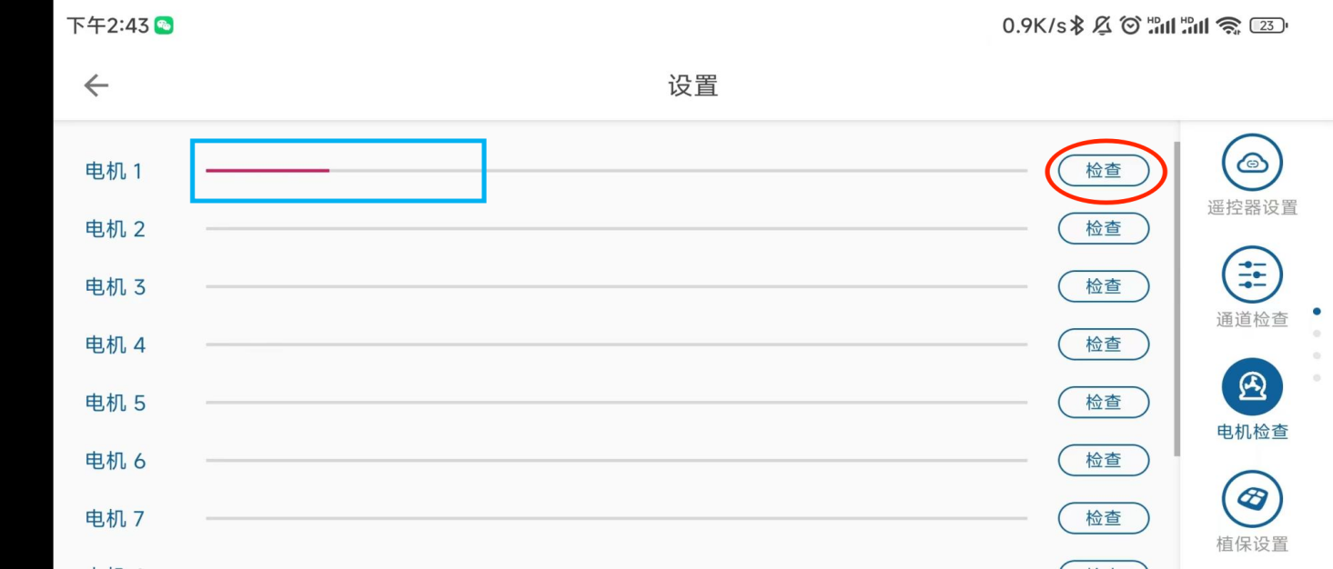 电机检查用来检查无人机的电机是否工作正常(油动直驱不具备电机检查功能)。点击对应每个电机的检查按钮,无人机的电机会旋转,同时在进度条上会显示电机转速情况,以此来判断电机工作情况。最多可以检查8个电机。
