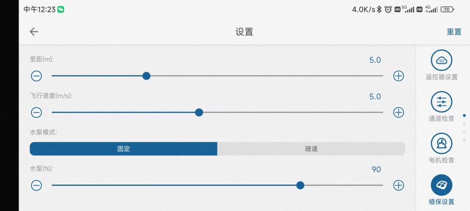 在植保设置中,用户可以调节垄距(AB航线间距),飞行速度(最大速度),以及用两种方式设置喷洒流量(选择固定时设置的时水泵的电机的工作功率百分比从0-100;选择随速时根据飞机的速度最大时的亩用量)。