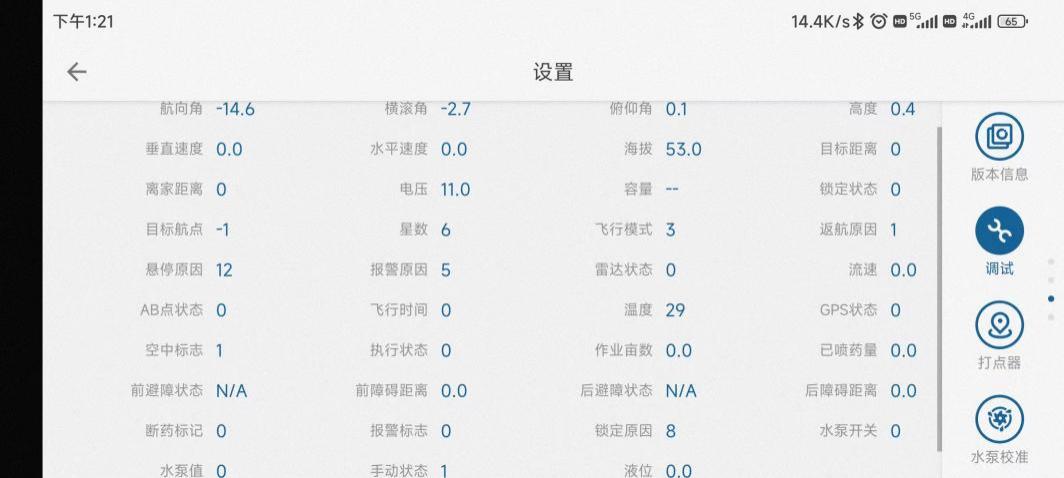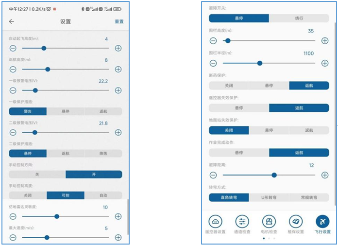 设置功能包括配置与无人机的遥控器设置、植保设置、遥控器通道检查、电机检查、飞行校准和读取飞行日志等功能。