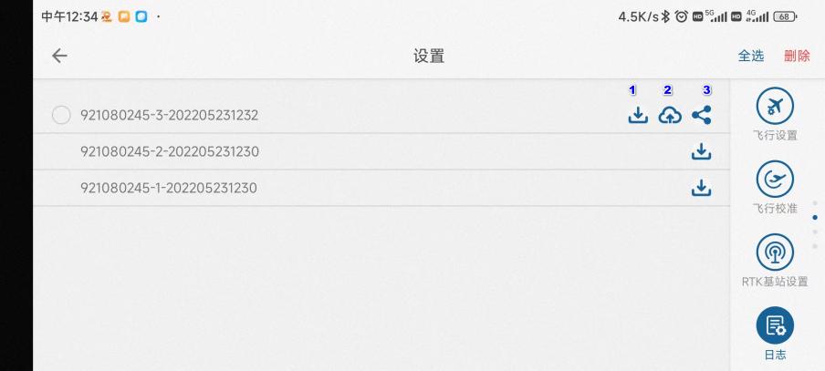 每条日志后边第一个按钮是下载按钮,可以把日志从飞控读取到APP本地。当读取完成后,日志后会多出来两个按钮,上传按钮:将日志上传到云服务器,制造商可从云平台获取日志文件。分享按钮:可以可以通过微信/QQ等社交软件发送给其他人。